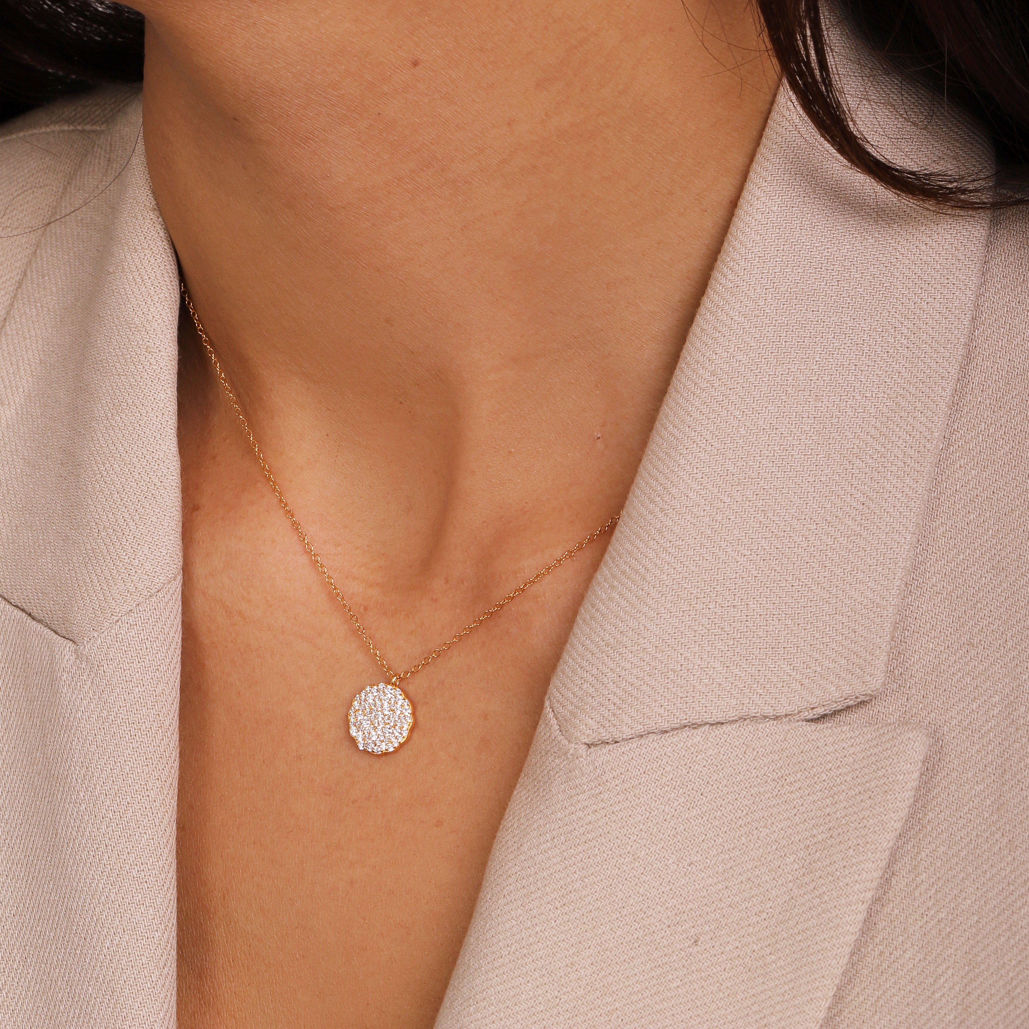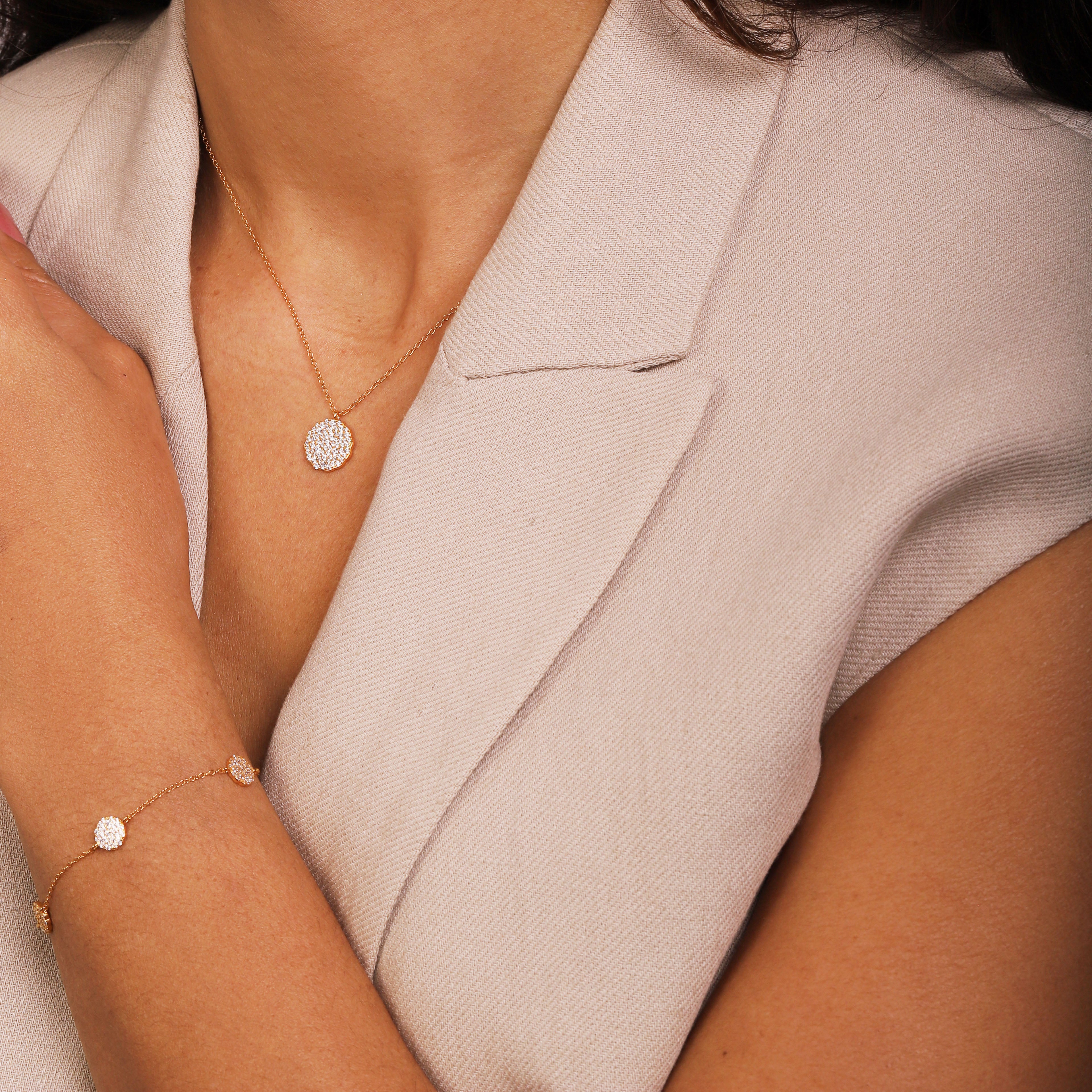 Our most sparkly collection yet, meet the Aurora Collection. Each piece in the collection comprises lots of tiny, but very sparkly, pavé-set stones set inside an organic-shaped disc. Contemporary, yet timeless, this collection is designed to be worn on repeat.